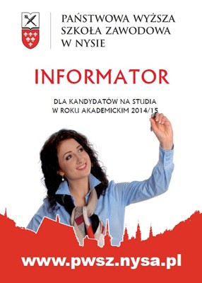 Informujemy, że na stronie www.rekrutacja.pwsz.nysa.pl jest dostępny wirtualny informator dla kandydatów na Studentów w roku akademickim 2014/2015. Wersję papierową informatora można zdobyć we wszystkich budynkach PWSZ w Nysie (wyeksponowany jest przy portierni) oraz w uczelnianym Biurze Promocji (ul. Marcinkowskiego 6-8).